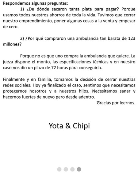 Finalmente se apunta que usaron sus ahorros de toda la vida para cumplir con la obligación de comprar una ambulancia para donarla e incluso tuvieron que cerrar el emprendimiento que tenían.