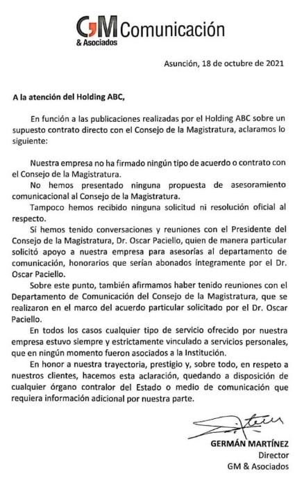 Afirma que existe un acuerdo, sin embargo fue entablado con el titular del Consejo, Oscar Paciello. “Sí hemos tenido conversaciones y reuniones con el Presidente del Consejo de la Magistratura, Dr. Oscar Paciello, quien se manera particular solicitó apoyo a nuestra empresa para asesorías al departamento de comunicación, honorarios que serían abonados íntegramente por el Dr. Oscar Paciello”, señala.