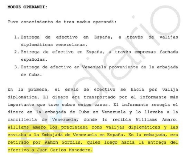 “El dinero era transportado por el informante más importante que tuve sobre estos casos. El informante recogía el dinero en la Embajada de Cuba en Venezuela y lo llevaba a la cancillería de Venezuela, donde lo recibía Williams Amaro. Williams Amaro lo precintaba como valija diplomática y enviaba el dinero a la Embajada de Venezuela en España. En la Embajada, era retirado por Ramón Gordils, quien luego hacía la entrega del efectivo a Juan Carlos Monedero”, relató.