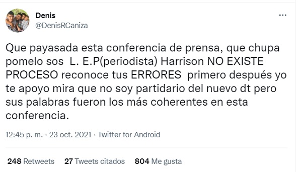 “Que payasada esta conferencia de prensa, que chupa pomelo sos L. E.P(periodista) Harrison NO EXISTE PROCESO reconoce tus ERRORES primero después yo te apoyo mira que no soy partidario del nuevo dt pero sus palabras fueron los más coherentes en esta conferencia (sic)”, lanzó el exfutbolista Denis Caniza en su cuenta en Twitter.