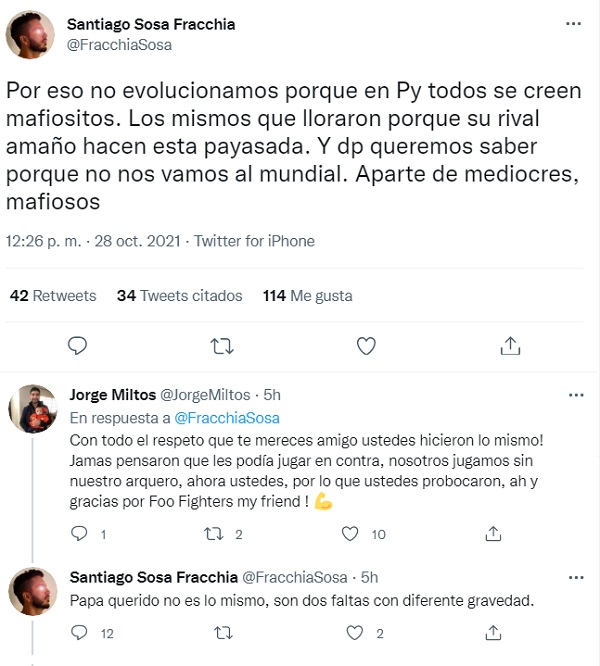 “Por eso no evolucionamos porque en Py todos se creen mafiositos. Los mismos que lloraron porque su rival amaño hacen esta payasada. Y dp queremos saber porque no nos vamos al mundial. Aparte de mediocres, mafiosos (sic)”, tuiteó.