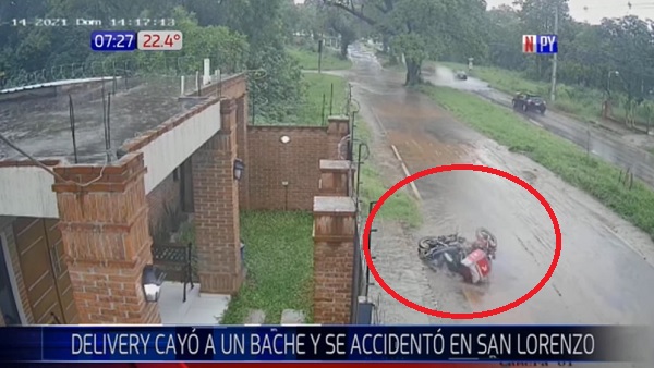 Un trabajador dedicado a realizar entregas cayó en el asfalto mojado, luego de ser desestabilizado a un bache que estaba camuflado con agua.