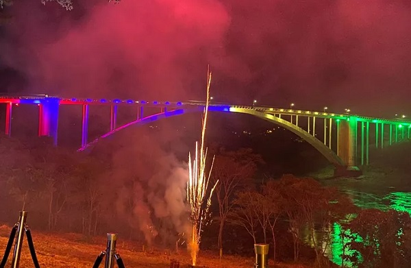 El Puente de la Amistad luce una iluminación temática con los colores de las banderas de Paraguay Brasil.