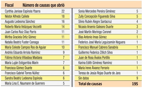 La lista es la como sigue, con la cantidad de casos atendidos: Cynthia Janisse Espínola Ybarra (22), Néstor Alfredo Cañete (18), Augusto Ledesma (16), Roberto María Velázquez Vezzetti (14, exfiscal), Juan Carlos Ruiz Díaz Parris (11), Mirtha Graciela Ortiz Gómez (11), Natalia Beatriz Fúster Careaga (11), María Celeste Campos Ros de Aguiar (10), Andrés Eduardo Arriola Ramírez (9), Fátima Victoria Villaboa Maidana (7), María Luján Estigarribia Marín (7), Francisca Gómez Duarte (6), Francisco Gabriel Torres Núñez (6), Sandra Beatriz Ledesma Espínola (6), María Lina E. Naumann de Guerrero (5), Sonia Mercedes Pareira Giménez (5), Zully Concepción Figueredo Silva (5), Silvio Rubén Alegre Santacruz (4), Nicasio Arsenio Galeano Duarte (3), José Martín Morínigo Coronel (2), Blas Antonio Imas Gómez, Federico José María Leguizamón Noguera, Francisco Manuel Cabrera Sanabria, Guillermo Federico Zilich Silva (exfiscal ahora juez), Juan de Rosa Ávalos Portillo, Karina Edith Giménez Ramírez, María Irene Álvarez Ferrario y Teresa de Jesús Rojas Duarte de Jara (estos últimos todos con un caso).