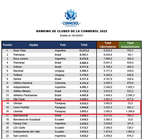 “La CONMEBOL lanzó el Ranking de Clubes CONMEBOL 2022, el cual se utiliza para la conformación de los bolilleros para el sorteo de las Fases 1 y 2 de la CONMEBOL Libertadores 2022 y posteriormente para las Fases de Grupos de la CONMEBOL Libertadores y CONMEBOL Sudamericana 2022”, señala el sitio de la Conmebol.