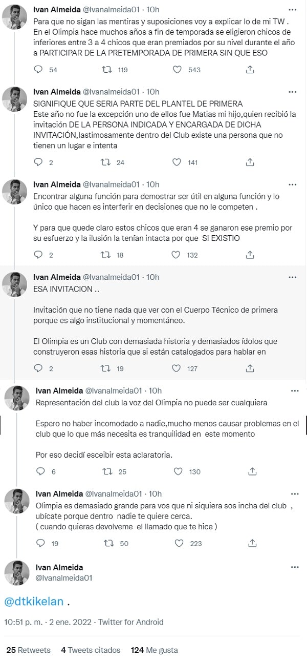 “Para que no sigan las mentiras y suposiciones voy a explicar lo de mi TW. En el Olimpia hace muchos años a fin de temporada se eligieron chicos de inferiores entre 3 a 4 chicos que eran premiados por su nivel durante el año a PARTICIPAR DE LA PRETEMPORADA DE PRIMERA SIN QUE ESO SIGNIFIQUE QUE SERIA PARTE DEL PLANTEL DE PRIMERA (sic)”, fue lo que comenzó posteando Almeida en Twitter.