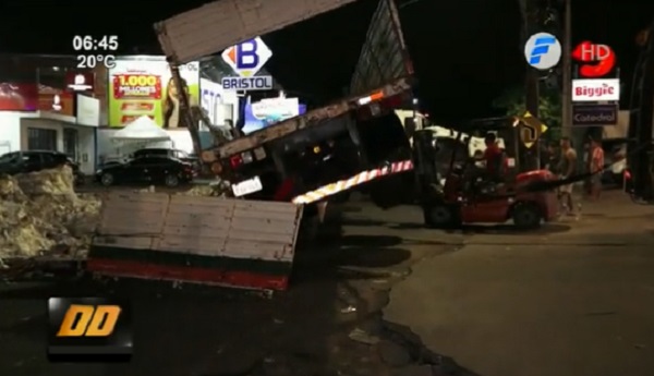 Tras realizar un giro en la calle Nuestra Señora de la Asunción, para ingresar a la avenida Von Poleski, de la ciudad de Villa Elisa, un camión de gran porte sufrió el desprendimiento de su carrocería. El percance ocurrió cerca de las 22 horas del lunes.