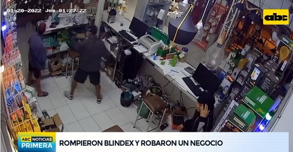 Tres jóvenes a bordo de una motocicleta, llegaron hasta un negocio, rompieron la puerta de blindex e ingresaron al local. Luego revisaron todo el sitio y optaron por llevarse un monitor con su CPU.