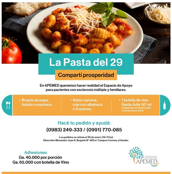 El día 29 de cada mes es tradicional un almuerzo de pastas como buen augurio de bienestar y prosperidad. El primer 29 de este año es para la APEMED, de manera a lograr la instalación de un Espacio de Apoyo.
