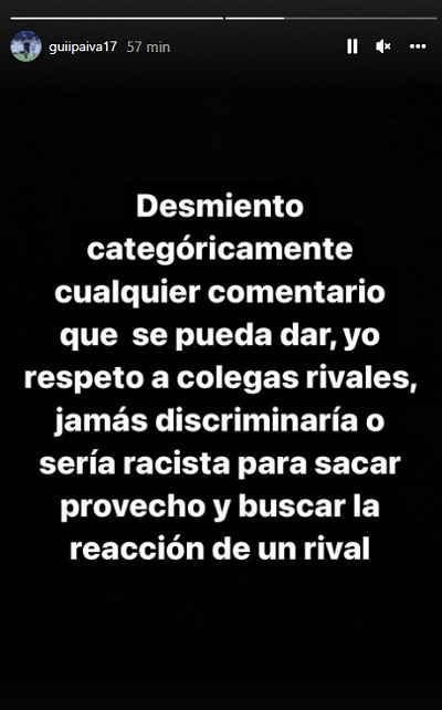Tras lo señalado, el jugador del Olimpia, utilizó la misma vía para salir al paso de la acusación. “Desmiento categóricamente cualquier comentario que se pueda dar, yo respeto a colegas rivales, jamás discriminaría o sería racista para sacar provecho y buscar la reacción de un rival”, tecleó.