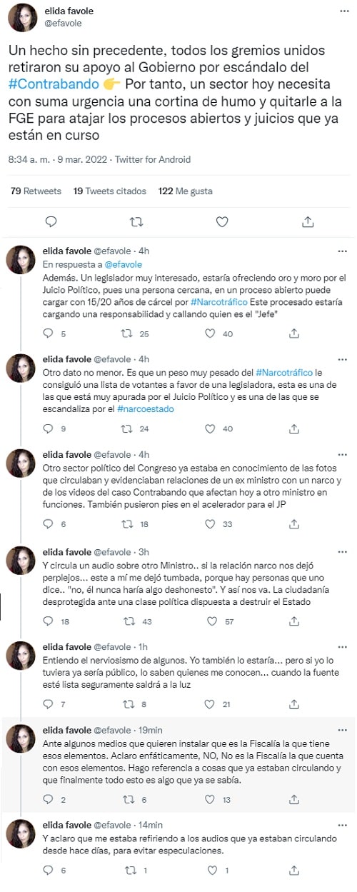 En su hilo de Twitter dijo que otro sector político del Congreso conocía las fotos que circulaban donde se muestra la relación de un exministro con un narcotraficante y los videos que afecta a otro secretario de Estado en funciones.