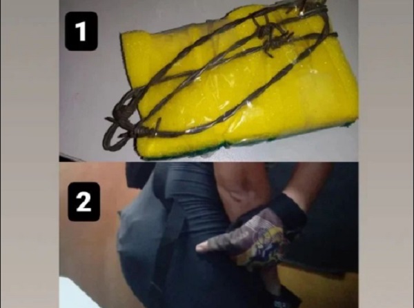 El “Anti_Nalgadas” está hecho con una esponja de cocina común, a la cual le colocó un pedazo de “alambre de púa, para que le clave en las manos al que me nalguee”, señaló en su publicación.