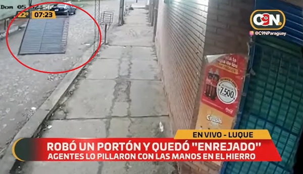 El hecho se viralizó en las redes sociales, donde se difundió el video del robo de un portón y el preciso momento en el que el solitario delincuente era llevado junto con objeto robado a ser devuelto.