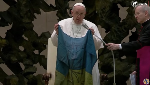 El Santo Padre mostró en el Aula Pablo VI del Vaticano una bandera que llegó a Roma desde Bucha, la ciudad cercana a Kiev donde los rusos han dejado numerosos cuerpos sin vida por las calles.