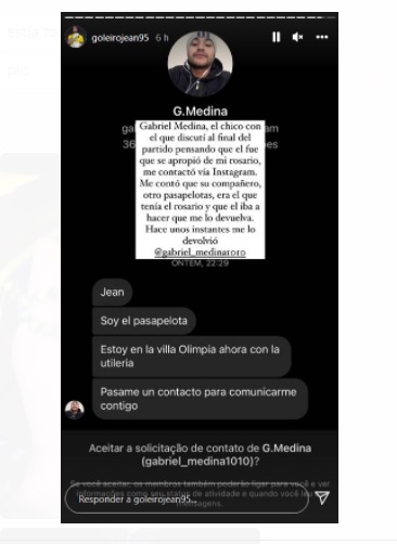 Sin embargo, la historia tuvo un final feliz. El pasapelotas acusado por el arquero, identificado como Gabriel Medina, se comunicó con él y le confesó quien en realidad tenía su rosario. Además, se comprometió a ayudar a recuperarlo, y así fue.