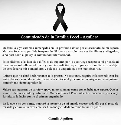 “Mi familia y yo estamos sumergidos en un profundo dolor por el asesinato de mi esposo Marcelo Pecci y su pérdida irreparable. El luto no es solo para sus familiares y allegados, sino para todo el país y la comunidad internacional”, comienza señalando el texto publicado en medios.
