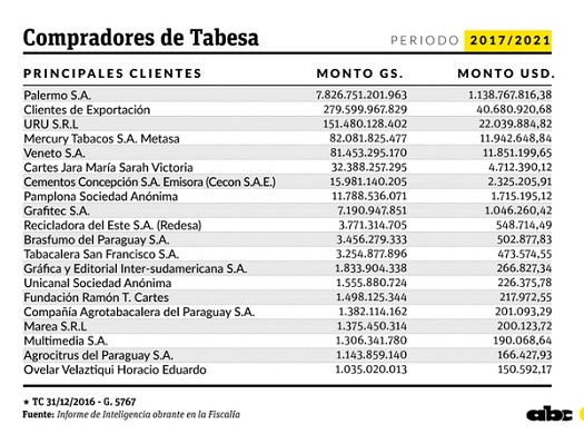 Según la tabla, en el periodo de tiempo comprendido entre 2017 y 2021, el principal comprado es Palermo S.A., empresa del propio Horacio Cartes, además aparece Mercury Tabacos S.A., del diputado Erico Galeano.