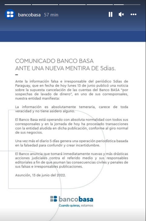 “El Banco Basa está operando con absoluta normalidad con todos sus corresponsales y en la jornada de hoy ha procesado transacciones con la entidad aludida en dicha publicación, conforme al giro normal de sus negocios”, agrega.