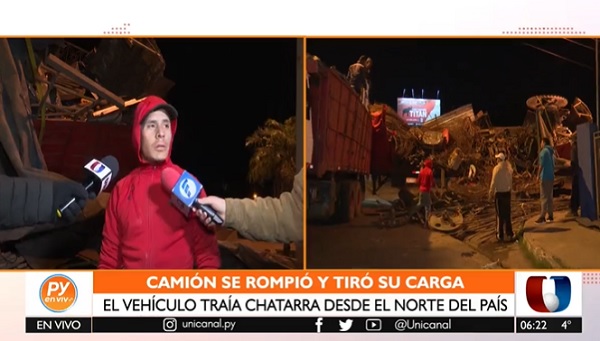 Aparentemente el camión que provenía del norte del país y tenía como destino la ciudad de Ñemby cruzó un badén y el peso de la carga hizo que la carreta se volcara de un lado dejando caer las chatarras en el asfalto.