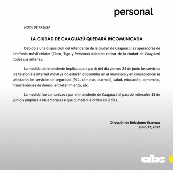 La firma Personal dio a conocer un escrito en el cual señala la situación que se vive en la localidad citada. “Debido a una disposición del intendente de la ciudad de Caaguazú las operadoras de telefonía móvil celular (Claro, Tigo y Personal) deberán retirar de la ciudad de Caaguazú sus antenas”, indica la primera parte.