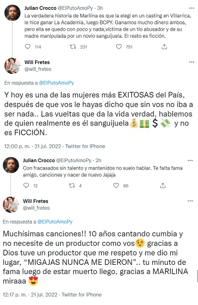 “Muchísimas canciones!! 10 años cantando cumbia y no necesite de un productor como vos gracias a Dios tuve un productor que me respeto y me dio mi lugar, ‘MIGAJAS NUNCA ME DIERON’.. tu minuto de fama luego de estar muerto llego, gracias a MARILINA miraaa (sic)”, se defendió Fretes.