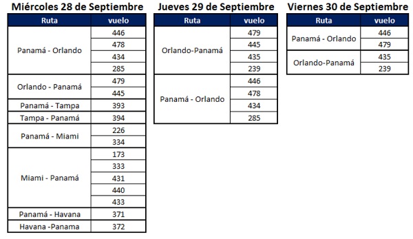 La compañía se vio obligada a cancelar vuelos desde y hacia Orlando, Tampa, Miami (Estados Unidos) y Habana (Cuba) entre 28 y el 30 de septiembre, informó Copa. En tanto, las operaciones desde y hacia Ft. Lauderdale (Estados Unidos), por el momento, permanecen según los itinerarios establecidos.