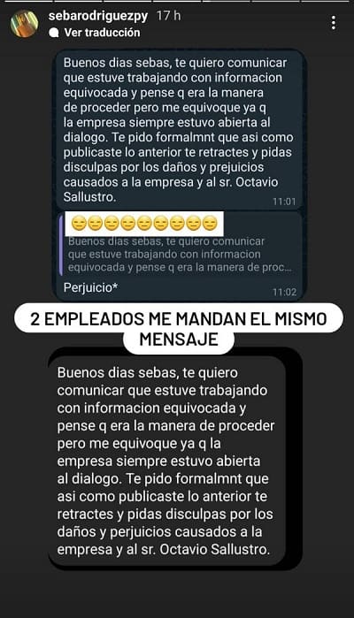 Asimismo, expuso el mensaje que le llegó por parte de la empleada, que en un principio dijo que había denunciado a la empresa y que decía lo siguiente: “Buenos días Sebas, te quiero comunicar que estuve trabajando con la información equivocada y pensé que era la manera de proceder pero me equivoqué ya que la empresa siempre estuvo abierta al dialogo. Te pido formalmente que así como publicaste lo anterior, te retractes y pidas disculpas por los daños y perjuicios causados a la empresa y al Señor Osmar Sallustro (sic)”.