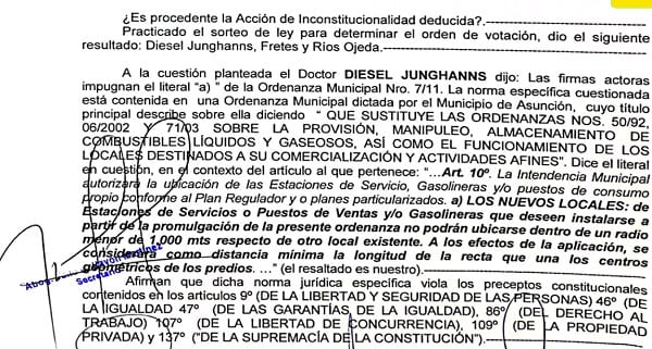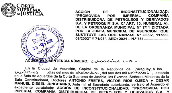 Este lunes se conocieron dos resoluciones de la Sala de la máxima instancia judicial. En la primera, se rechazó la acción promovida por la Asociación Cámara de Distribuidoras Paraguayas de Combustibles (CADIPAC), la cual pretendía anular una ordenanza municipal de la capital.