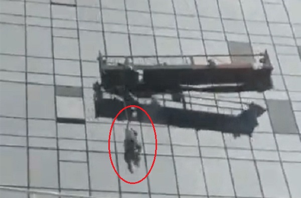 En otro material se logra ver al hombre de 32 años de edad, cuando aparentemente perdió el equilibrio y quedó colgado de un arnés, hasta que finalmente se cae desde una cierta altura. Otro de los trabajadores se quedó sobre la estructura y fue asistido.