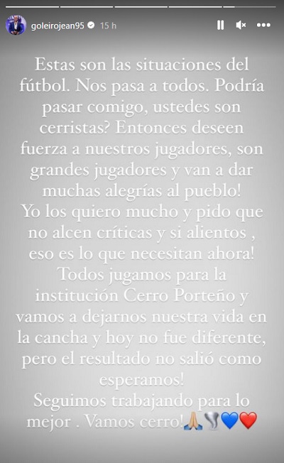 “Yo los quiero mucho y pido que no alcen críticas y si alientos, eso es lo que necesitan ahora! Todos jugamos para la institución Cerro Porteño y vamos a dejarnos nuestra vida en la cancha y hoy no fue diferente, pero el resultado no salió como esperamos! Seguimos trabajando para lo mejor. Vamos cerro! (sic)”, cierra el escrito del golero.