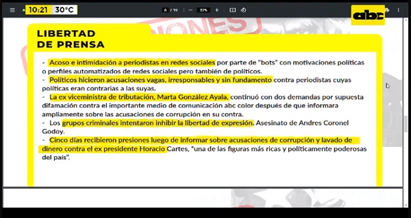En ese sentido, entre los varios casos se hizo mención “con nombre y apellido”, a la causa que lleva adelante la exministra de Tributación, Marta González Ayala, quien realizó dos demandas en contra de ABC Color, después de que el medio informara sobre acusaciones de corrupción en su contra.