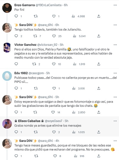 “Tengo toditos todavía, también los de Juliancito”, amplió posteriormente. “Estoy esperando que salgan a decir que es fotomontaje o algo así, para subir las grabaciones de pantalla que tengo de los chats”, continuó, entre otras cosas.