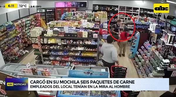 Las cámaras del circuito cerrado captaron el momento en que el joven guardó en su mochila seis paquetes de carne envasada.