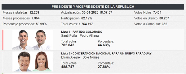 Con casi el 60% de las mesas escrutadas, los colorados tenían una diferencia a favor de casi 300.000 votos, al momento de esta publicación.