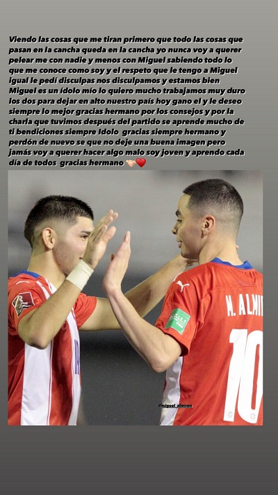 “Las cosas que pasan en la cancha se queda en la cancha, yo nunca voy a querer pelearme con nadie y menos con Miguel sabiendo todo lo que me conoce como soy y el respeto que le tengo”, publicó Enciso. “Le pedí disculpas, nos disculpamos y estamos bien”, tecleó para luego agregar que Almirón es un ídolo que tiene.