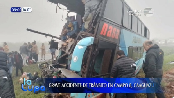 Un ómnibus de pasajeros de la empresa NASA Golondrina, un camión que transportaba granos, dos automóviles y una camioneta protagonizaron un violento choque en la mañana de este sábado en la ciudad de J. Eulogio Estigarribia, departamento de Caaguazú.