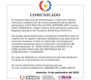 Si algún ciudadano se encuentra con el café “Kafee Wieneer Art” en el mercado o cualquier otro producto sin registro, puede hacer la denuncia correspondiente contactando al INAN a través de diferentes canales como el correo electrónico [email protected] o llamar a los números telefónicos (0961) 585779 o (0961) 155074.