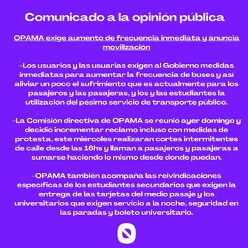 El comunicado de Opama es un llamado directo al Gobierno: “Los usuarios y las usuarias exigen medidas inmediatas para aumentar la frecuencia de buses y así aliviar el sufrimiento que actualmente padecen los pasajeros, las pasajeras y los estudiantes por el pésimo servicio de transporte público”.