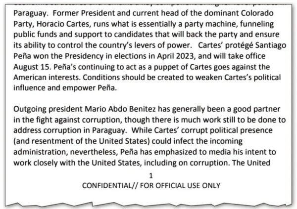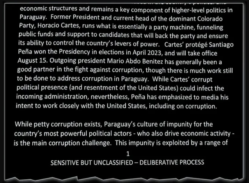 El documento también menciona a Santiago Peña, el protegido de Cartes, quien ganó la presidencia en las elecciones de abril 2023 y asumirá funciones el 15 de agosto. Según el documento, Peña ha enfatizado a los medios su intención de trabajar estrechamente con Estados Unidos, incluso en temas de corrupción.