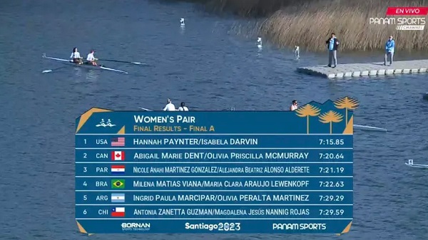 El cronómetro marcó 7 minutos, 19 segundos y 19 centésimas para la dupla paraguaya, que terminó a una diferencia de 5,34 segundos de las ganadoras del oro, las estadounidenses Hannah Paynter e Isabela Darvin. Las canadienses Priscilla Olivia Mcmurray y Abigail Marie Dent se llevaron la medalla de plata.