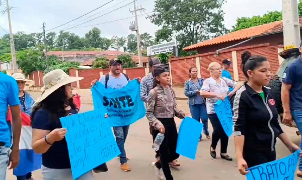 Este jueves, un grupo de docentes afiliados al Sindicato Nacional de Trabajadores de la Educación (Sinte) se congregaron frente a la residencia en Coronel Oviedo del presidente del Congreso, Silvio Ovelar, en respuesta a sus recientes comentarios despectivos hacia los profesores del interior del país.