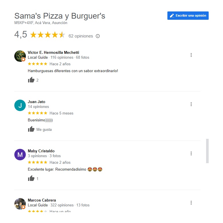Clientes opinando sobre la Pizzeria Sama’s. Captura