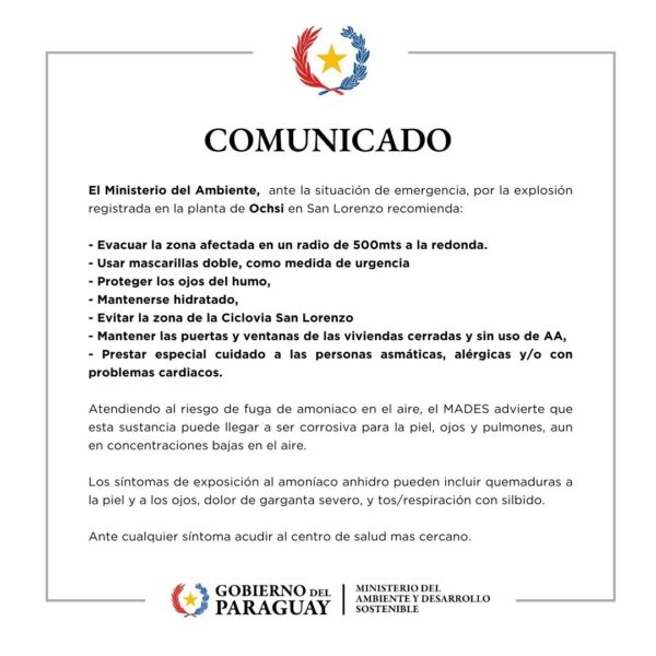 La empresa Ochsi emitió comunicado sobre explosión de garrafa con amoniaco en su planta de San Lorenzo. Aseguran que cumplieron protocolos, evacuaron personal y que ocurrió lejos del sector productivo.