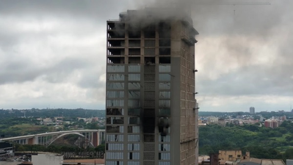 El capitán Ray Mendoza, segundo comandante del Cuerpo de Bomberos Voluntarios del Paraguay (CBVP), señaló que el incendio se concentra en los pisos 14, 15 y 16 del edificio.