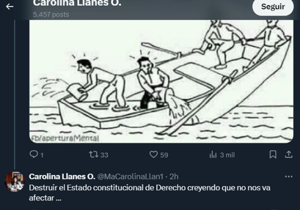 La ilustración compartida por Llanes representa a cuatro individuos en un bote a punto de hundirse, ignorantes de su mutua dependencia para la supervivencia. El comentario de uno de ellos, indiferente al peligro inminente que enfrentan los demás, sirve de metáfora para la situación política actual.