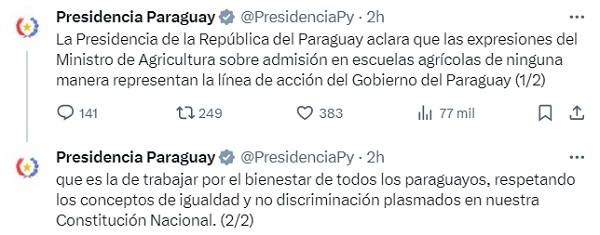 La Presidencia de la República emitió un breve comunicado desvinculándose de las expresiones del Ministro de Agricultura, asegurando que no representan la línea de acción del Gobierno del Paraguay, comprometido con el bienestar y la igualdad de todos los paraguayos.