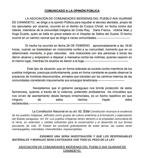 La Asociación de Comunidades Indígenas del Pueblo Ava Guaraní de Canindeyú emitió un comunicado para repudiar enérgicamente el alevoso atentado que el pasado 28 de febrero costó la vida a Darío Franco, líder de la comunidad Cristo Rey, y dejó en grave estado a Hugo Duarte, otro referente de la misma localidad.