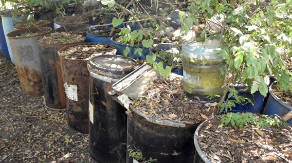 Algunos de estos recipientes presentan perforaciones y tapas faltantes, dejando expuestos los residuos oxidados y el crecimiento descontrolado de malezas. Con cada lluvia, los peligrosos desechos, que contienen metales pesados como el mercurio, hacen contacto con el agua, generando un líquido tóxico que se escurre pendiente abajo hasta desembocar en el cercano río Paraguay.
