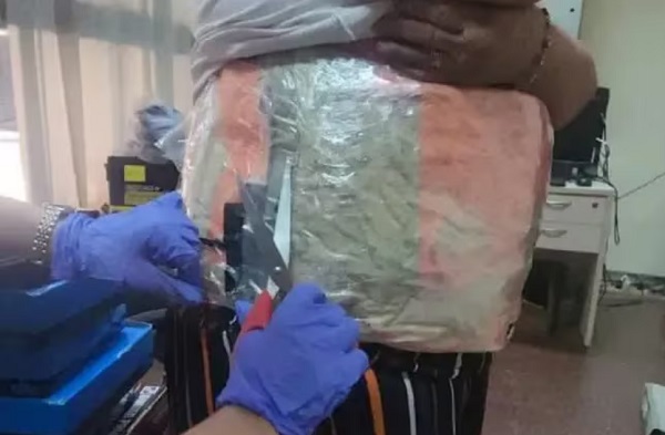 Los funcionarios aduaneros descubrieron que la mujer llevaba adheridos a su cuerpo dos paquetes de cocaína, cada uno con un peso de 2,5 kilogramos. La droga estaba distribuida en su abdomen y espalda, ocultando un total de 5 kilogramos de la sustancia ilícita.