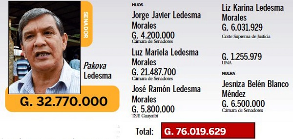 Por su parte, el senador José Pakova Ledesma no olvidó a ningún hijo, quienes se encuentran posicionados en la Cámara de Senadores, la Justicia Electoral, la Corte Suprema y la Universidad Nacional, con un costo total de 76 millones de guaraníes mensuales para el Estado.